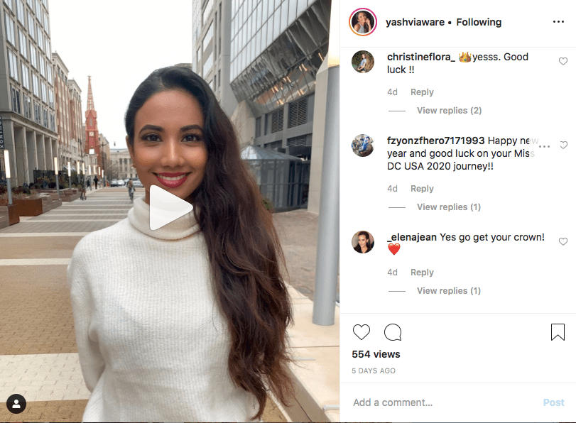 Miss Earth USA 2018, Yashvi Aware, officially announced she is competing at the Miss D.C. USA 2020 pageant as Miss Mount Vernon USA 2020. Yashvi shared the news of her new title through a video posted on her social media page to her followers. The pageant is set to take place this month, January 18-19th.