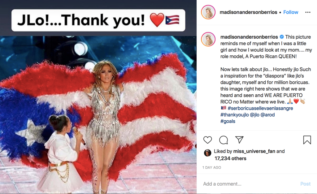 During the performance, JLo donned an American flag which, when opened, turned into the Puerto Rican Flag, in celebration of her Puerto Rican heritage. Madison felt a lot of emotions about this moment because in the 1940’s it was illegal for someone to carry a Puerto Rican flag with them. She shared, “to just see where we have come right now today, is inspirational.”